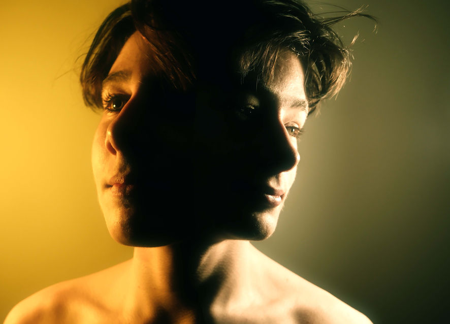 half of the face is in focus and expressive whilst the other half of the face is flooded with shadow and non-existent.